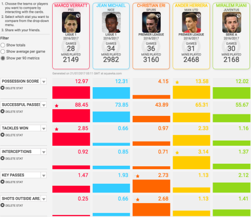 Verratti lidera con mucha diferencia el apartado del juego que le da calidad a la circulación de balón del equipo. También en el apartado defensivo destaca, sabe presionar y tacklea con éxito. Con más éxito roba balones Ander Herrera, que además lidera el apartado de posesión del balón. En las facetas del juego más creativas, como són las del último pase y los chuts fuera del área, destaca el danés Eriksen.