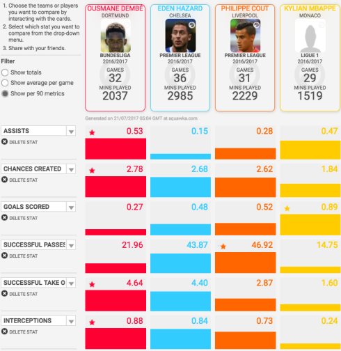Curioso el meneo que le da Dembélé a todos en cada uno de los apartados excepto en el de goles (Mbappé es más delantero que extremo) y precisión en los pases, donde Coutinho domina.