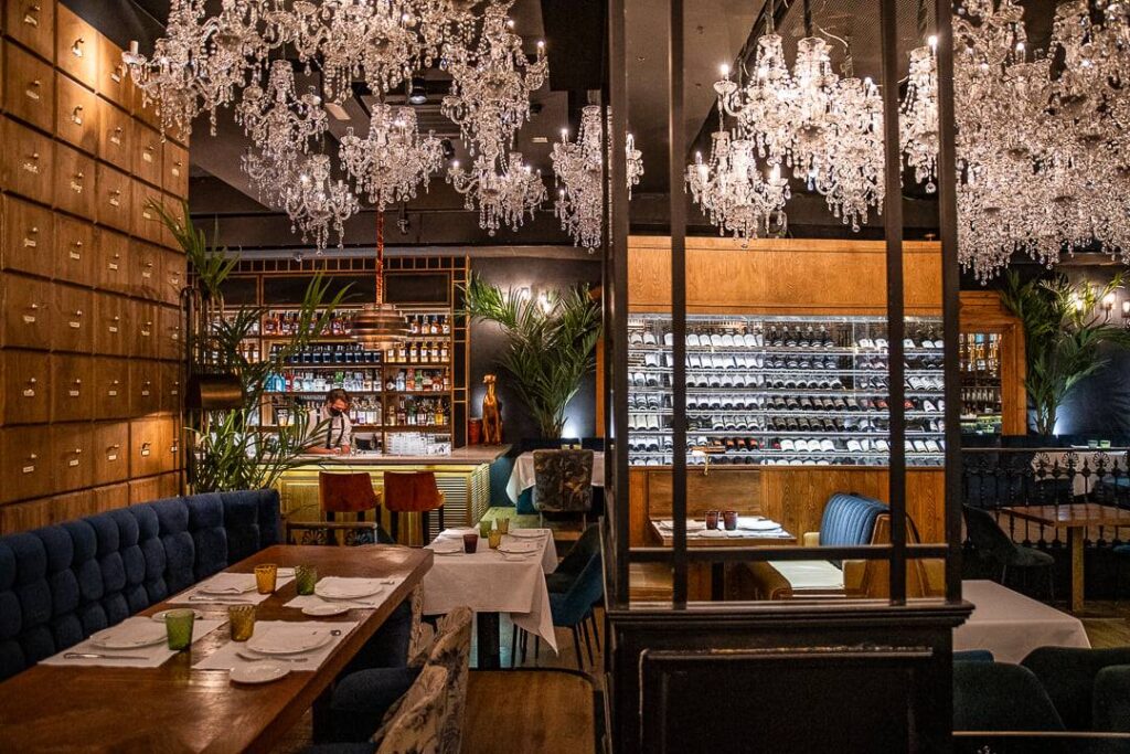 Una mesa larga en un restaurante. Copas de vino por todas partes. El camarero acaba de servir un plato de